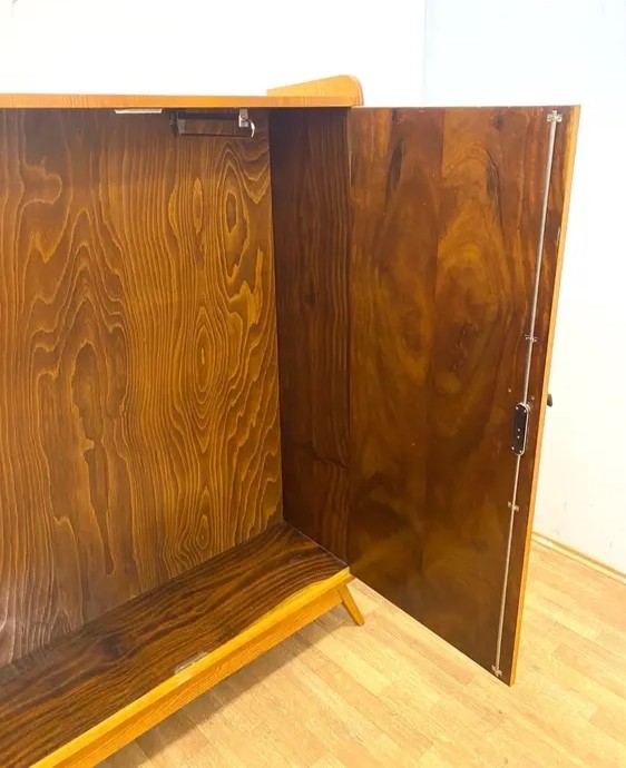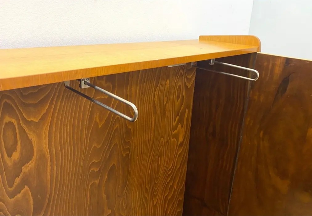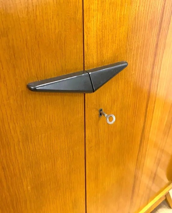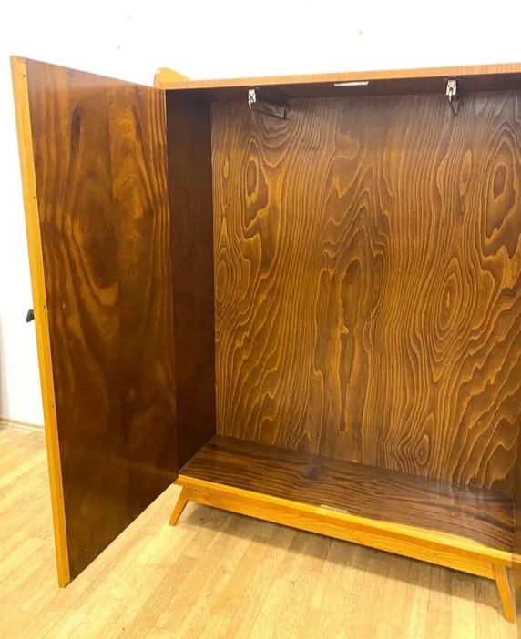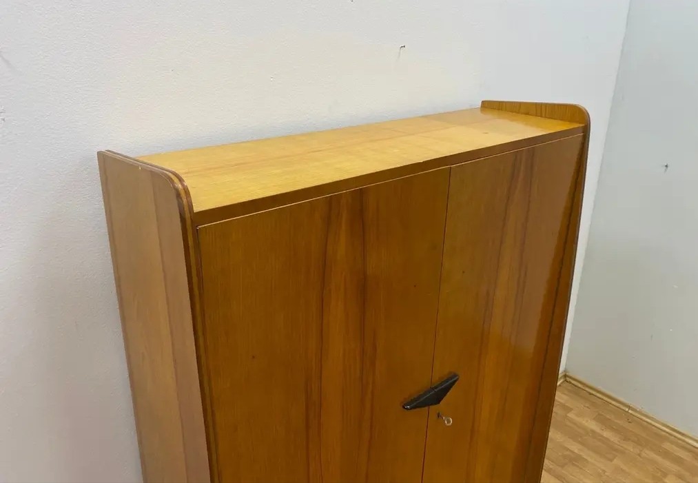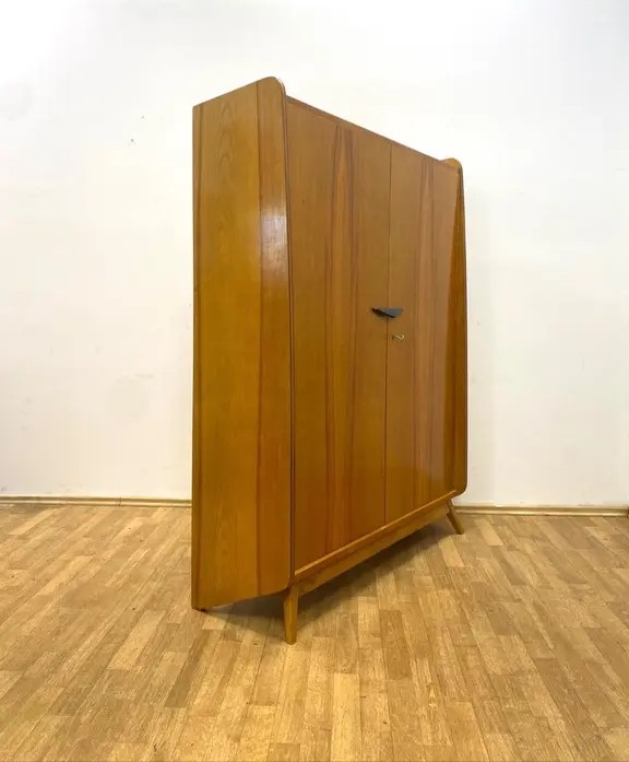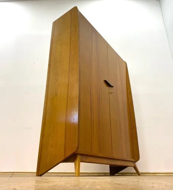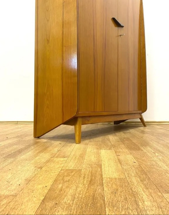 Très jolie et pratique armoire penderie vintage du design tchécoslovaque. Elle date des années 1950-60. Cette armoire a une forme originale en biais, elle est plus large en bas qu’en haut. Les pieds sont en compas, les bords sont arrondies et le bouton de la porte est en bois noir. La penderie se ferme à clé. A l’intérieur se trouvent deux porte manteaux télescopiques.