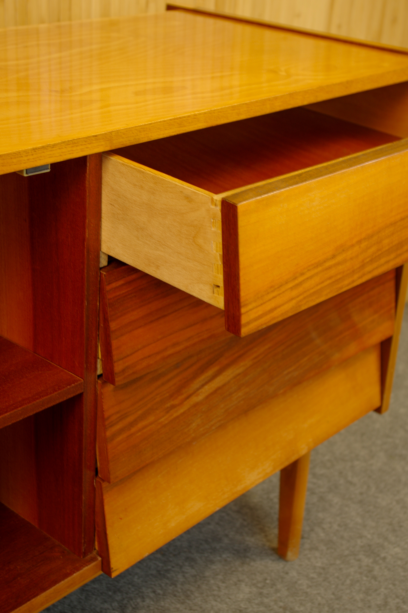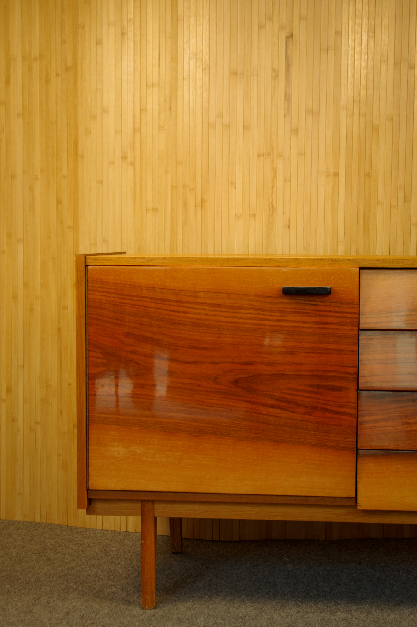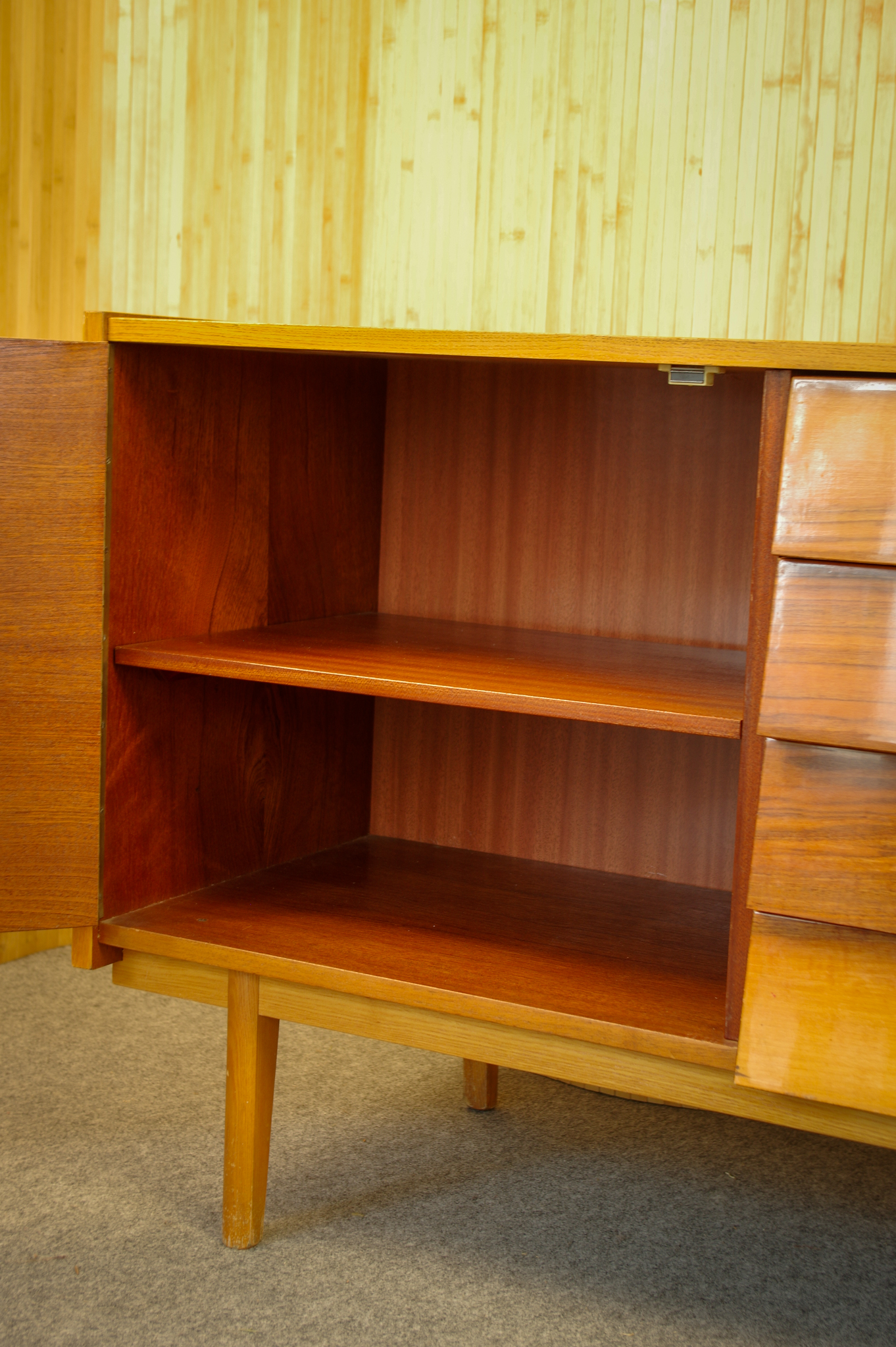 Très jolie commode vintage de fabrication tchécoslovaque des années 1960-70. Elle propose de nombreux rangements avec un espace à étagère qui ferme par une porte battante et 4 tiroirs. Le bouton de la porte ainsi que les pieds apportent une touche très décorative à la commode. Les tiroirs sont également travaillés d’une manière intéressante et du coup n’ont pas besoin de boutons pour les ouvrir. Le design de cette commode est très sobre et élégant en même temps. Elle peut s’accorder avec la grande enfilade car il s’agit de la même série.