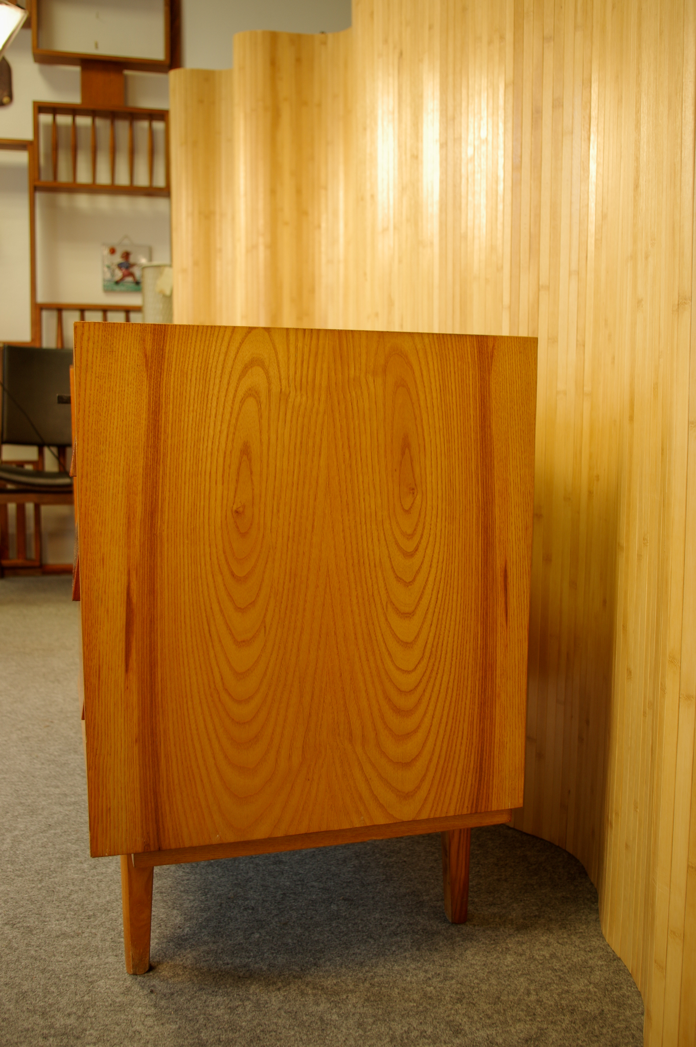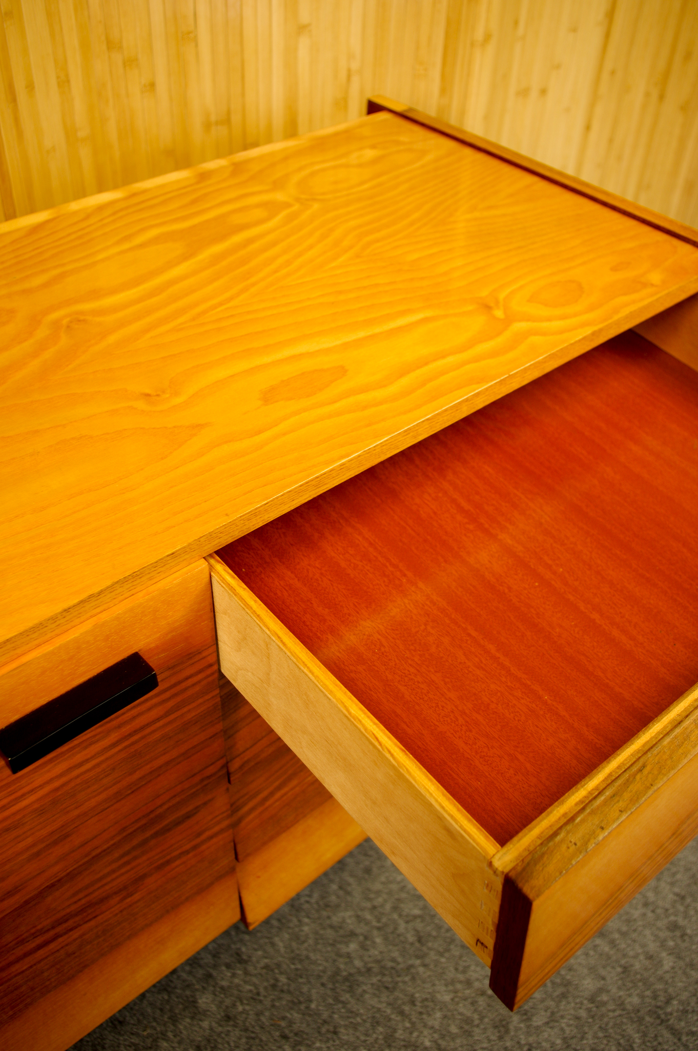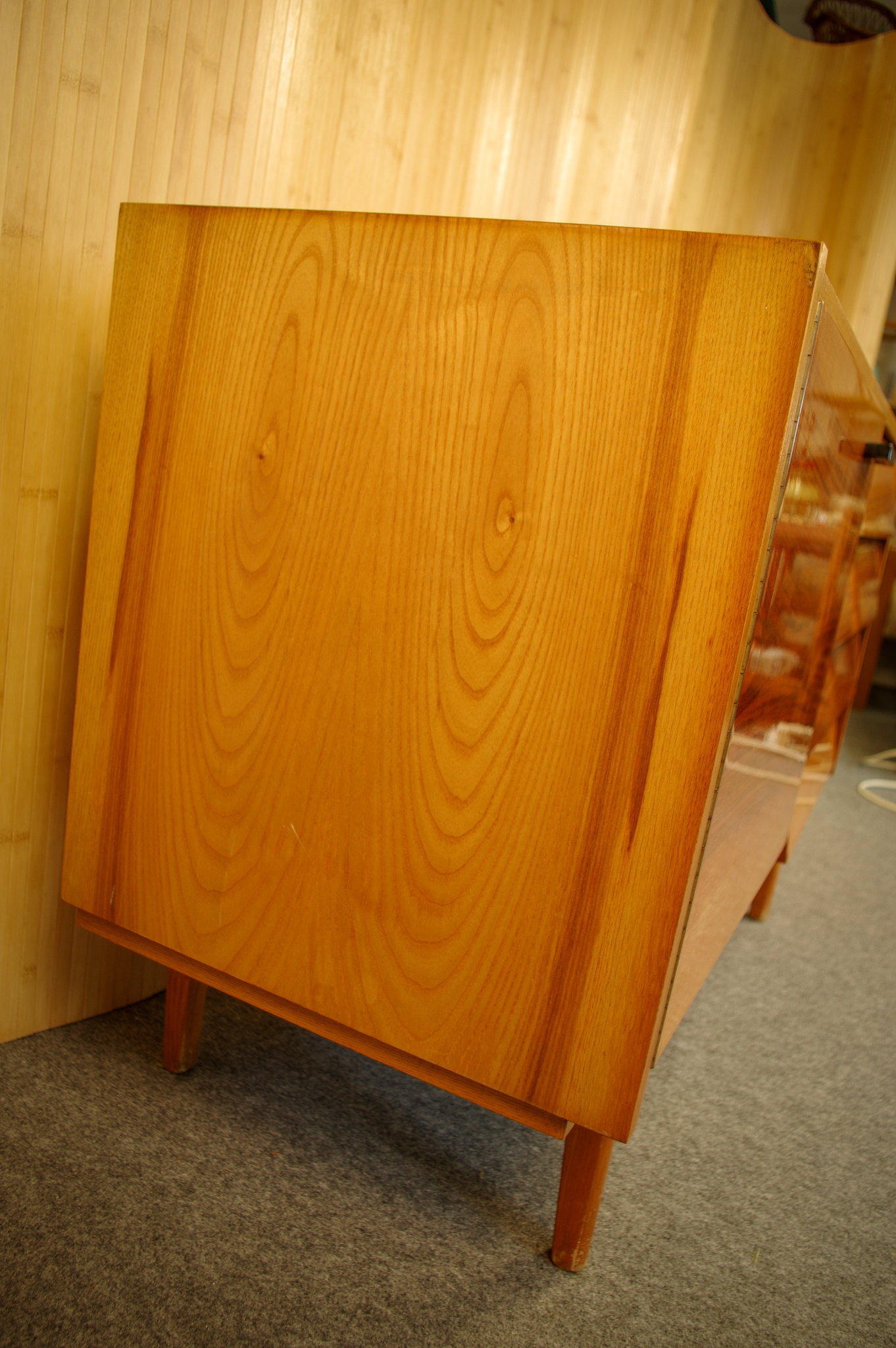 Très jolie commode vintage de fabrication tchécoslovaque des années 1960-70. Elle propose de nombreux rangements avec un espace à étagère qui ferme par une porte battante et 4 tiroirs. Le bouton de la porte ainsi que les pieds apportent une touche très décorative à la commode. Les tiroirs sont également travaillés d’une manière intéressante et du coup n’ont pas besoin de boutons pour les ouvrir. Le design de cette commode est très sobre et élégant en même temps. Elle peut s’accorder avec la grande enfilade car il s’agit de la même série.