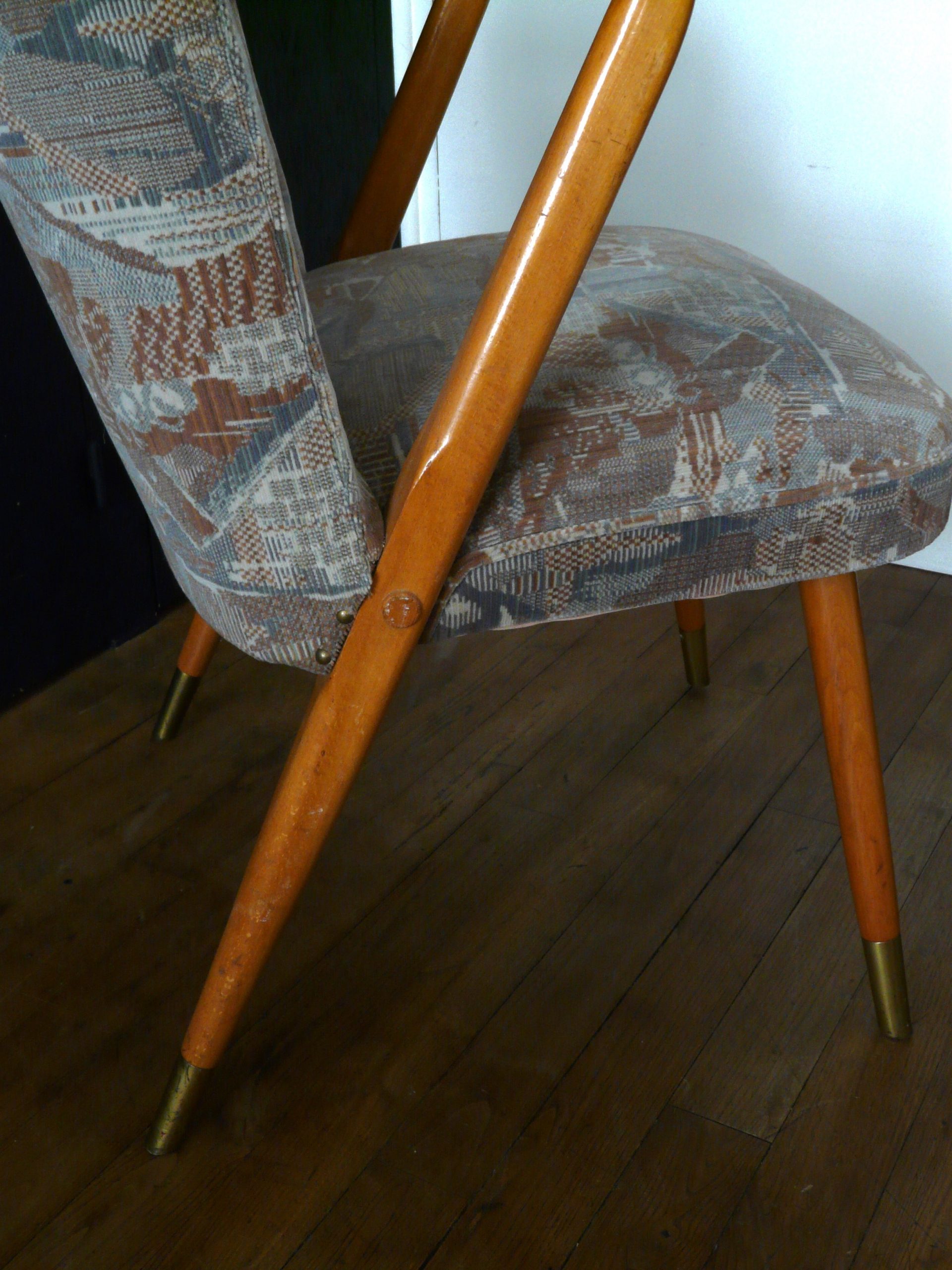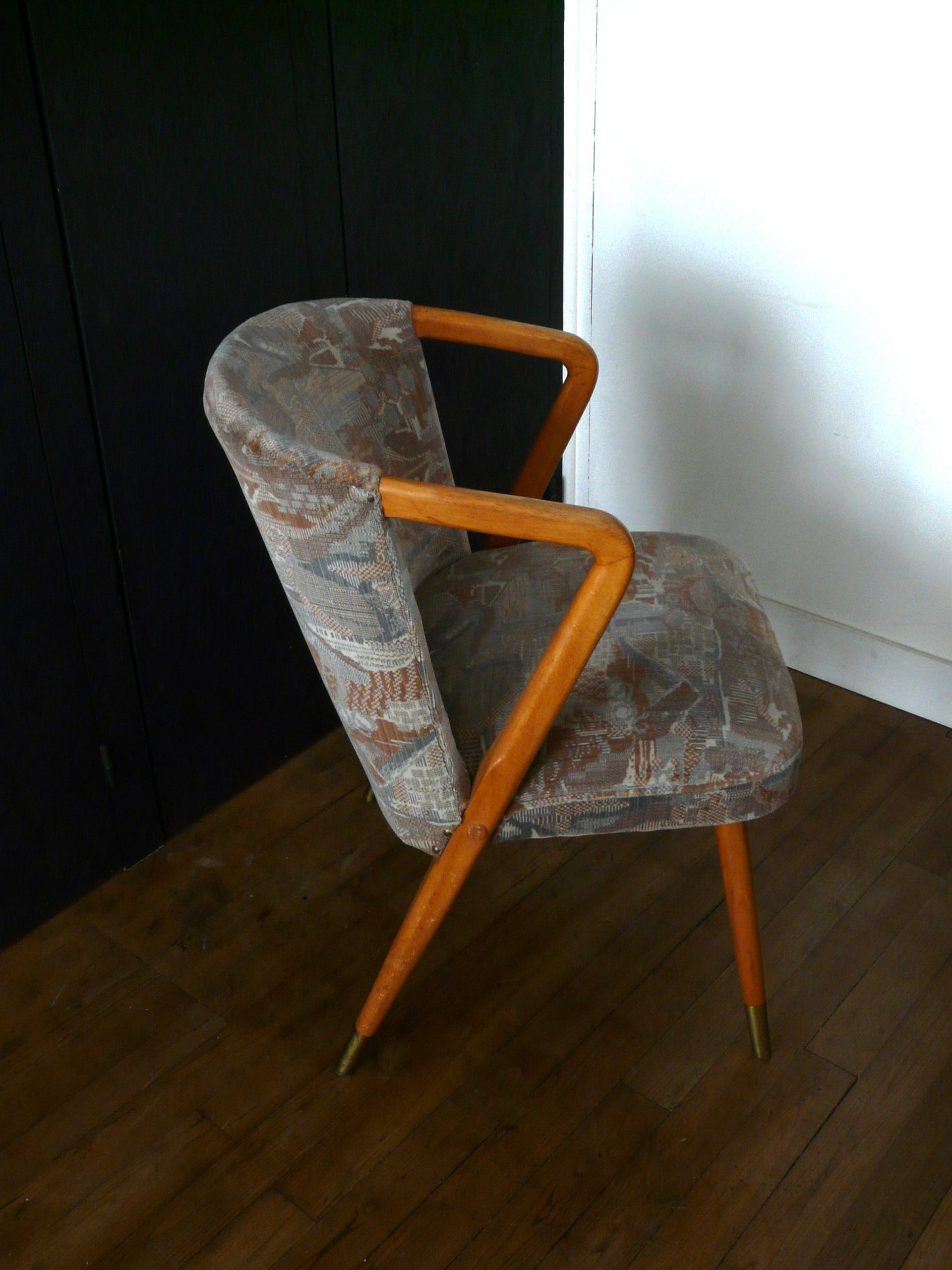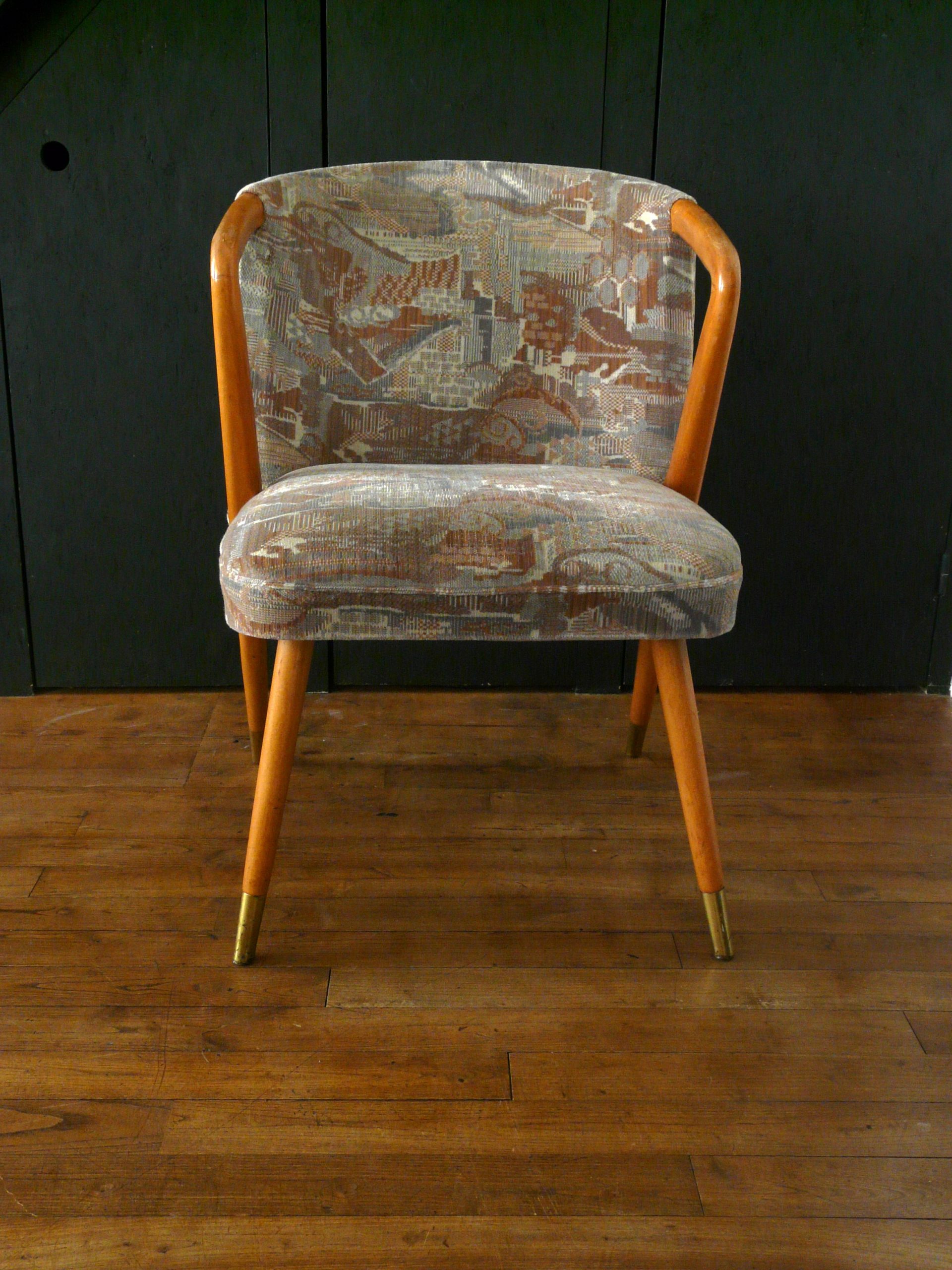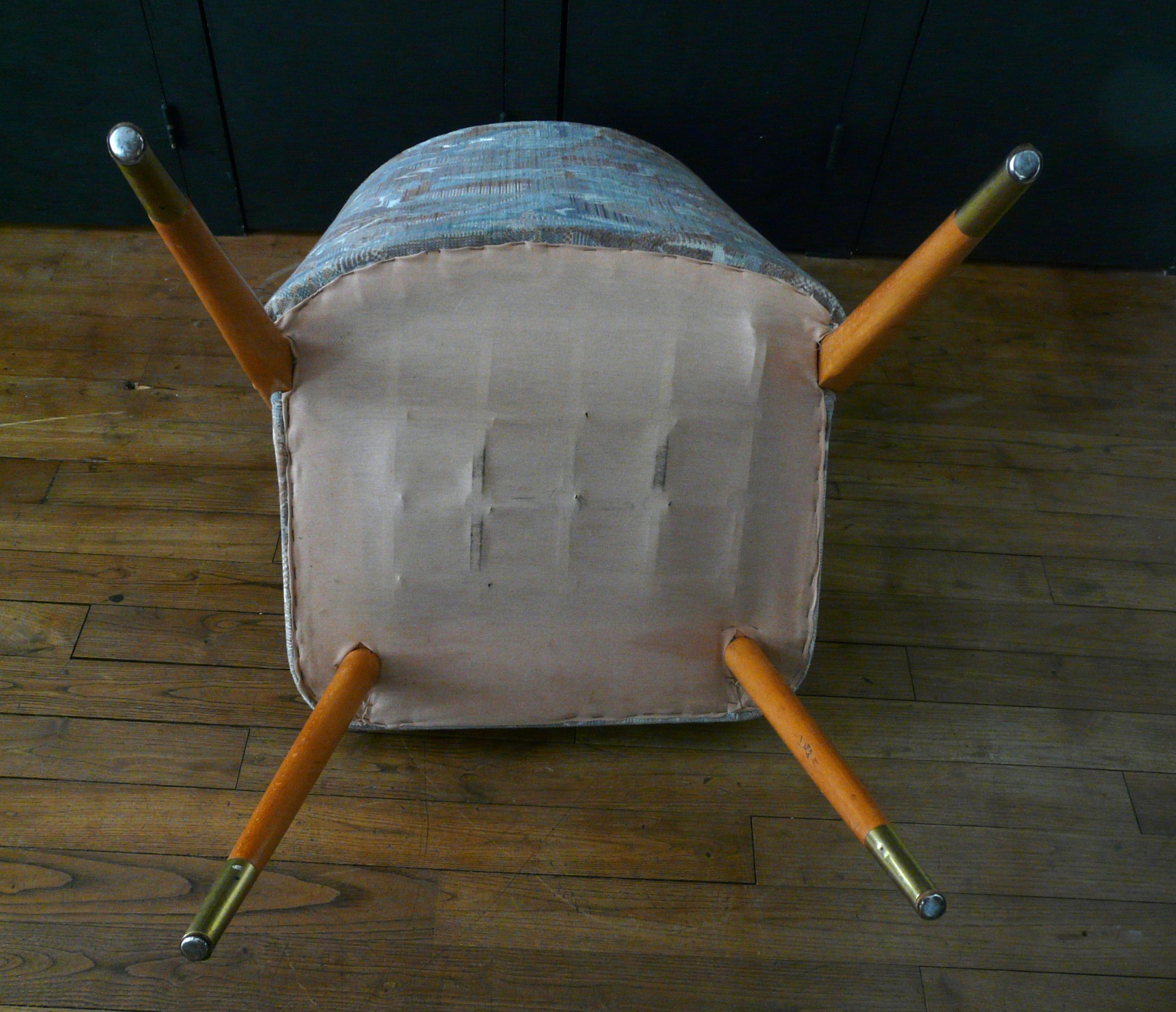 Rare fauteuil en bois et laiton vintage. Je l’ai chiné en Tchéquie et je pense qu’il s’agit de la fabrication tchécoslovaque. Il a une ligne très élégante avec ses pieds aux bouts en laiton! Très beau travail de menuiserie est effectué au niveau des jonctions des accoudoirs ainsi que les pieds. Le tissu n’est pas selon moi d’origine et en le changeant, le fauteuil pourrait gagner en style!