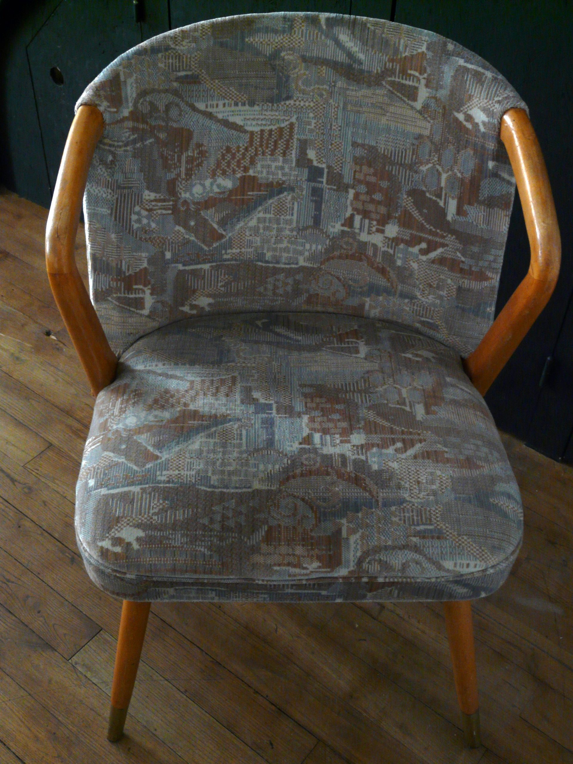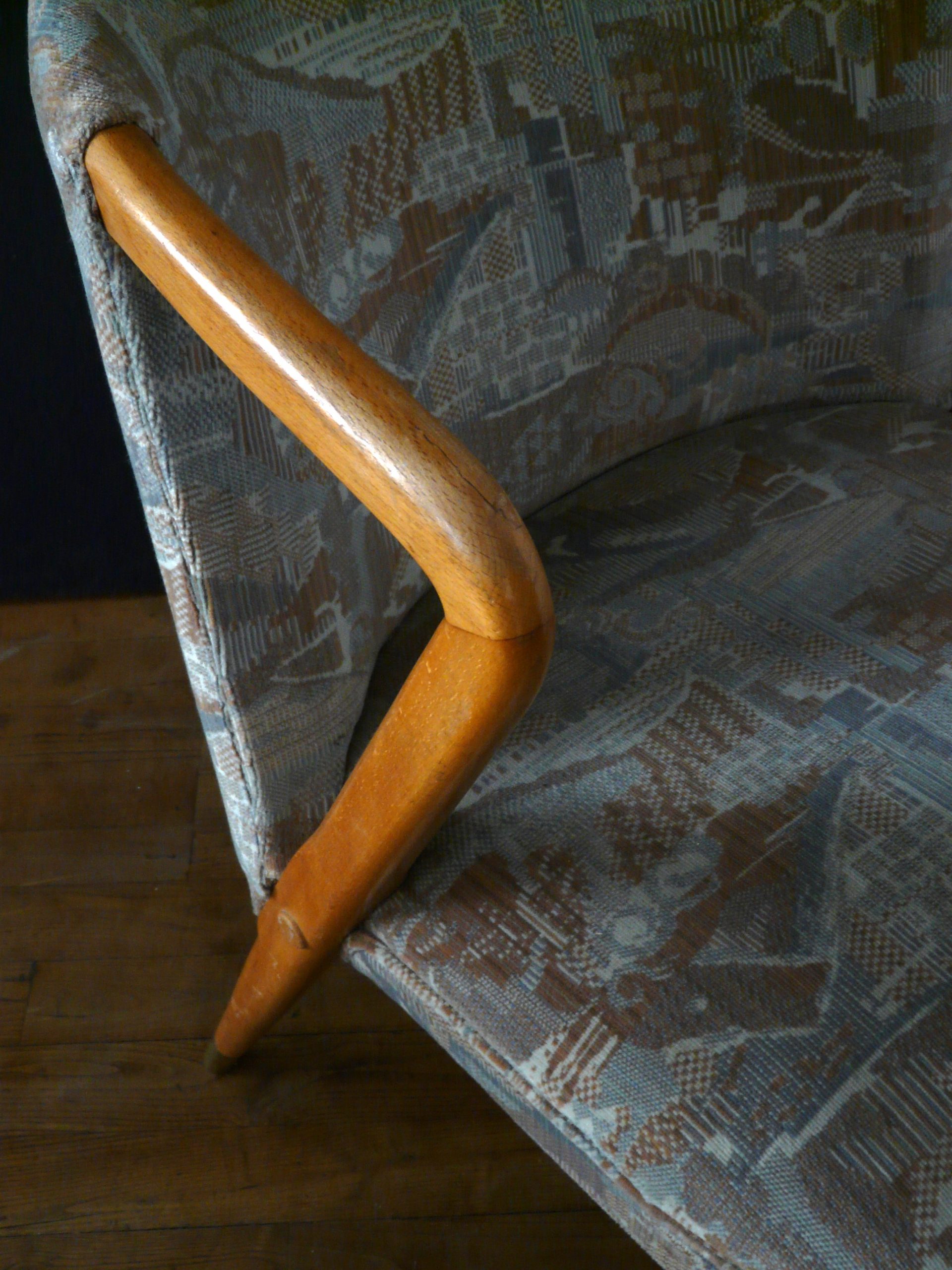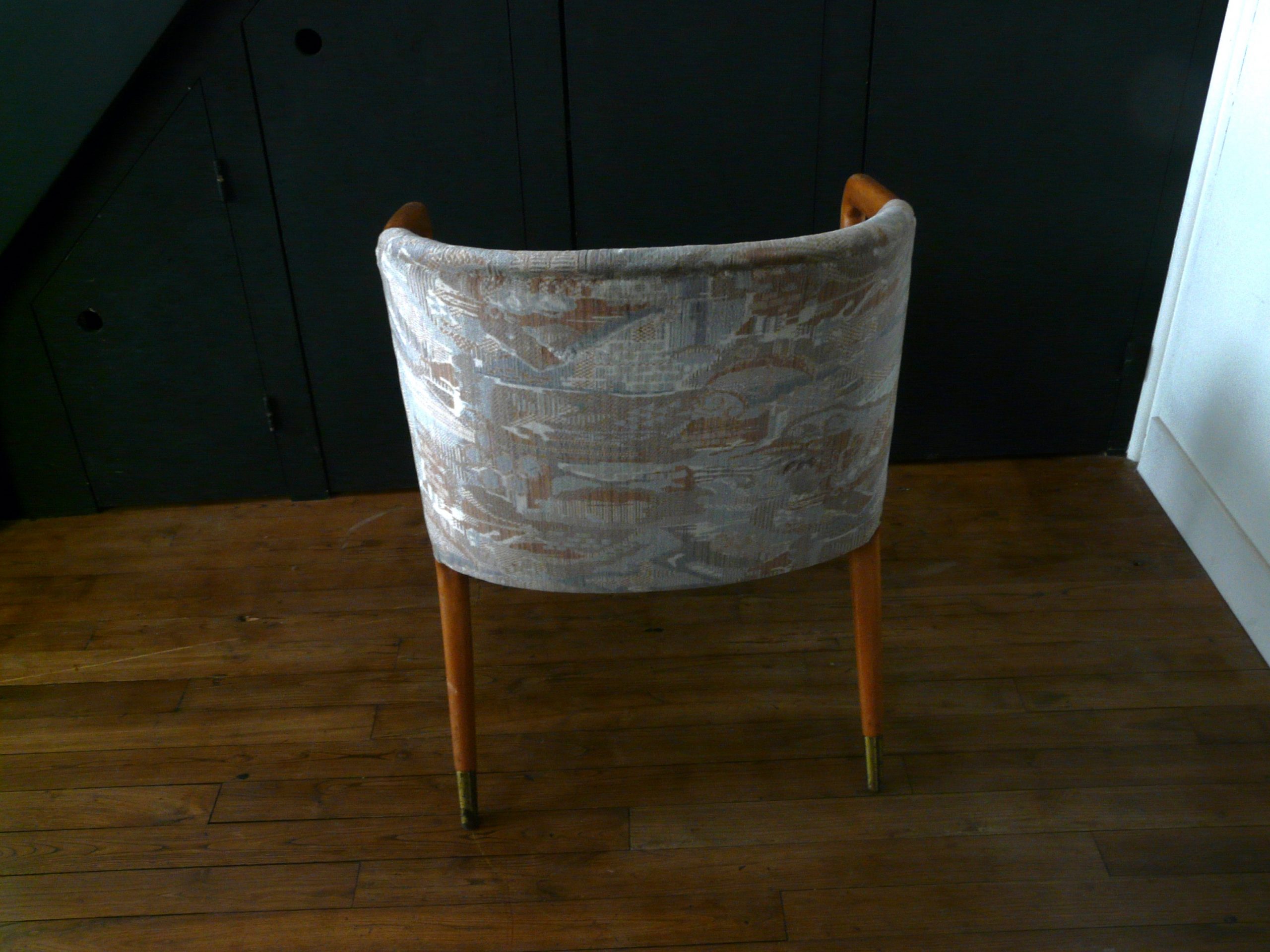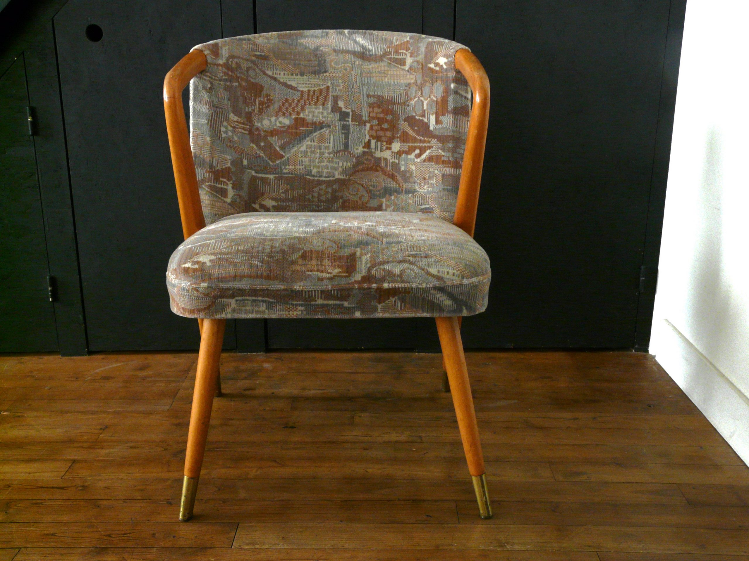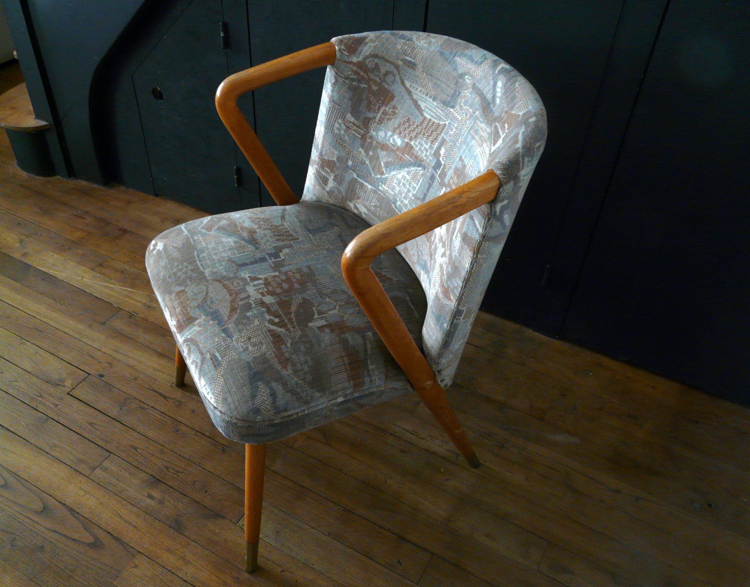 Rare fauteuil en bois et laiton vintage. Je l’ai chiné en Tchéquie et je pense qu’il s’agit de la fabrication tchécoslovaque. Il a une ligne très élégante avec ses pieds aux bouts en laiton! Très beau travail de menuiserie est effectué au niveau des jonctions des accoudoirs ainsi que les pieds. Le tissu n’est pas selon moi d’origine et en le changeant, le fauteuil pourrait gagner en style!