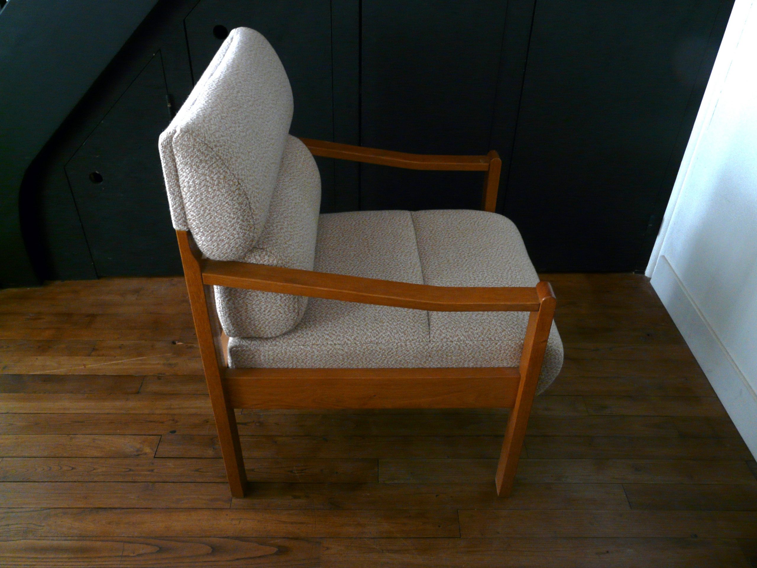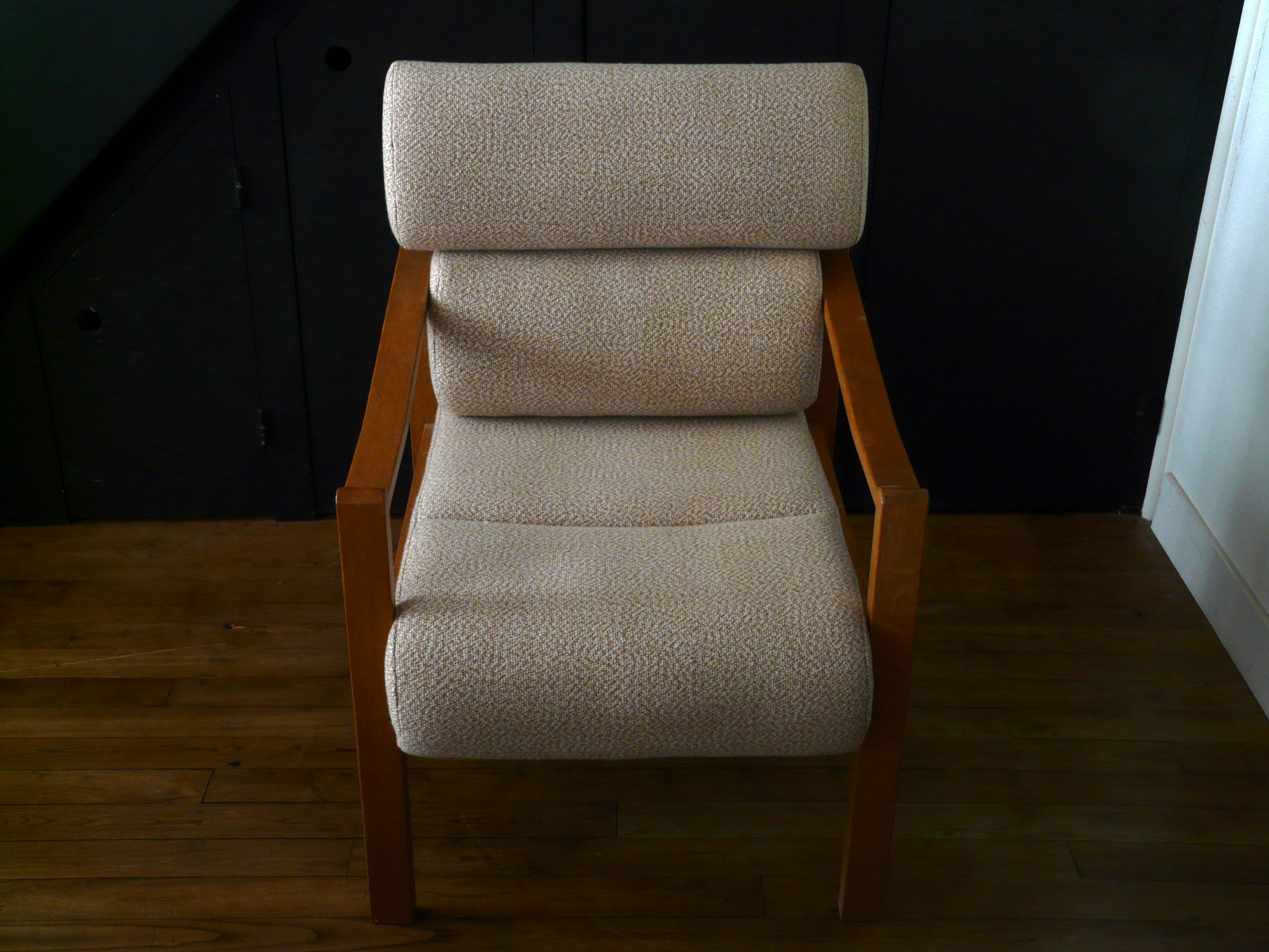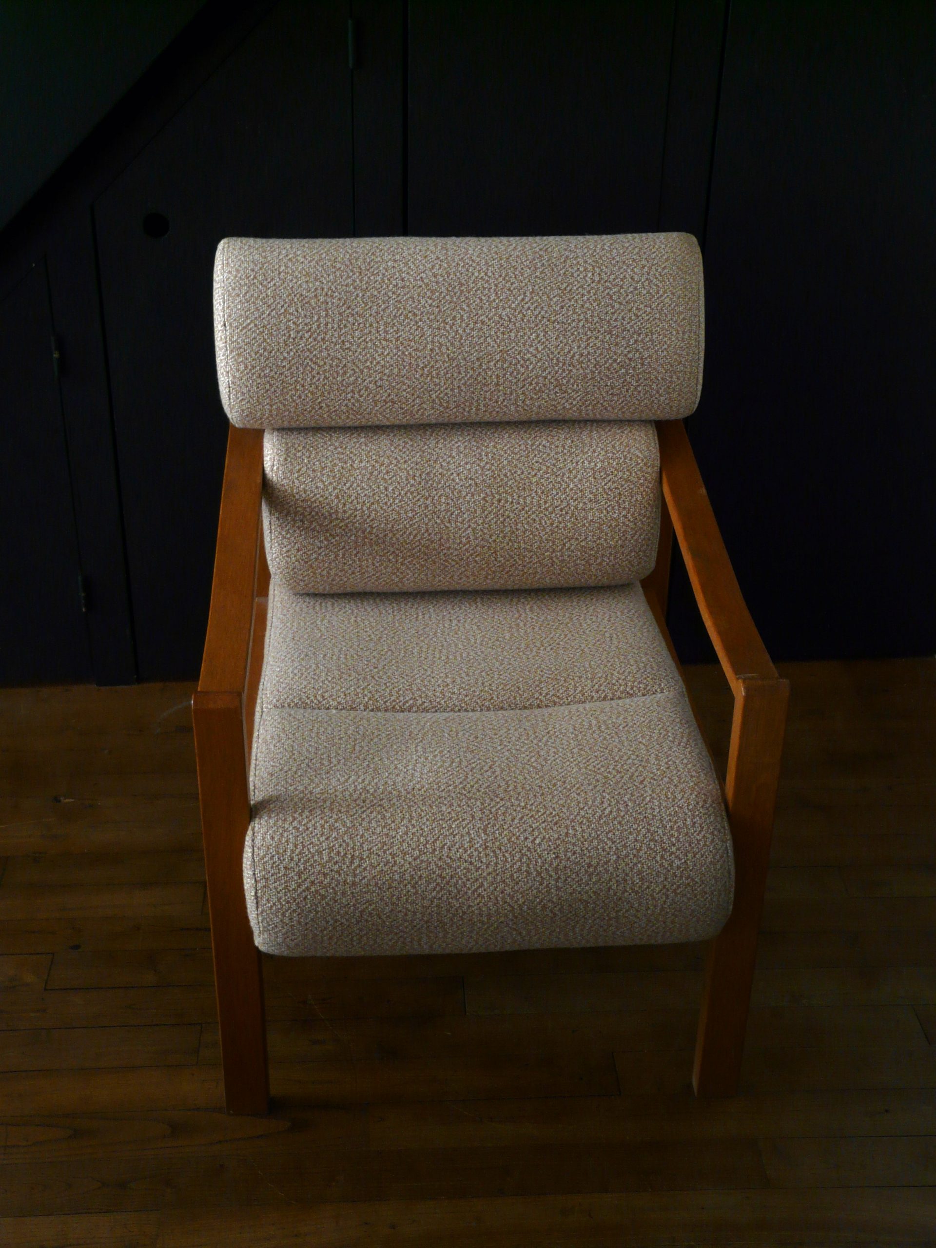 Confortable fauteuil Krasna Jizba. Il a été fabriqué en Tchécoslovaquie dans la deuxième moitié du XX siècle. Ce fauteuil en bois a été édité par Krasna Jizba qui encourageait les collaborations entre les jeunes designers, les artisans et les fabricants industriels. C’est un gage de qualité. Le fauteuil est estampillé. Sa ligne est sobre et moderne. Le tissu d’origine de couleur beige chiné est en bel état.