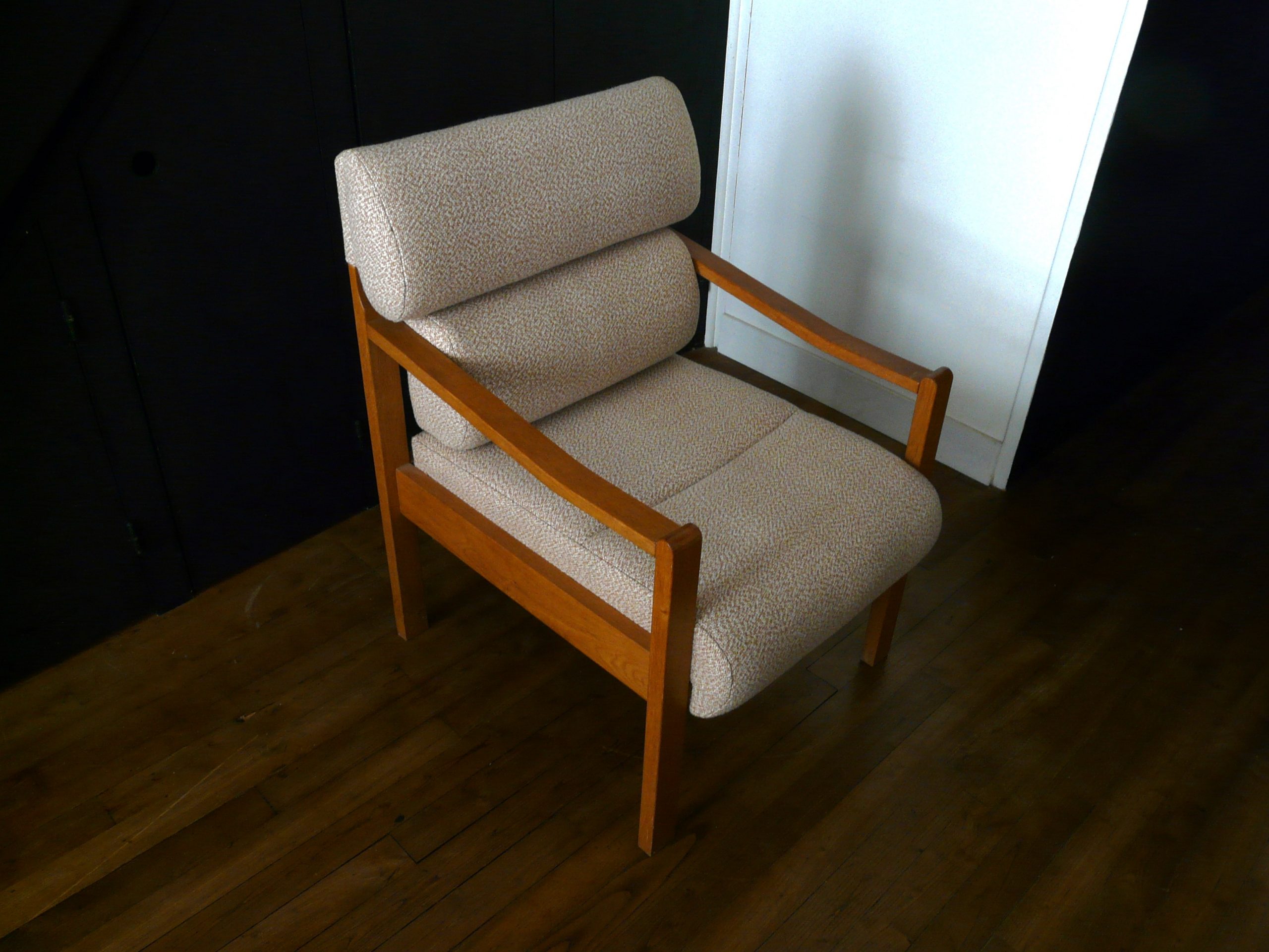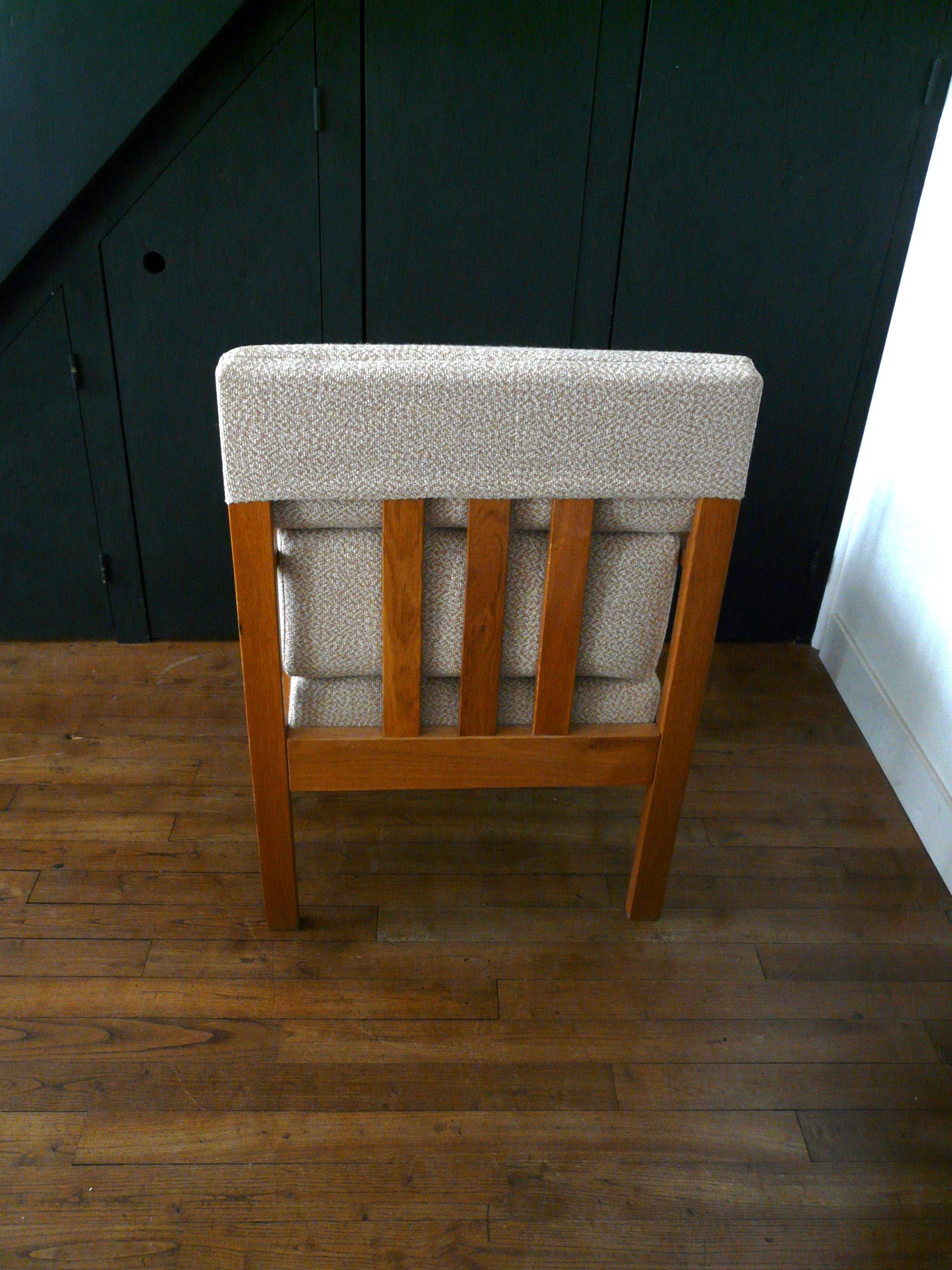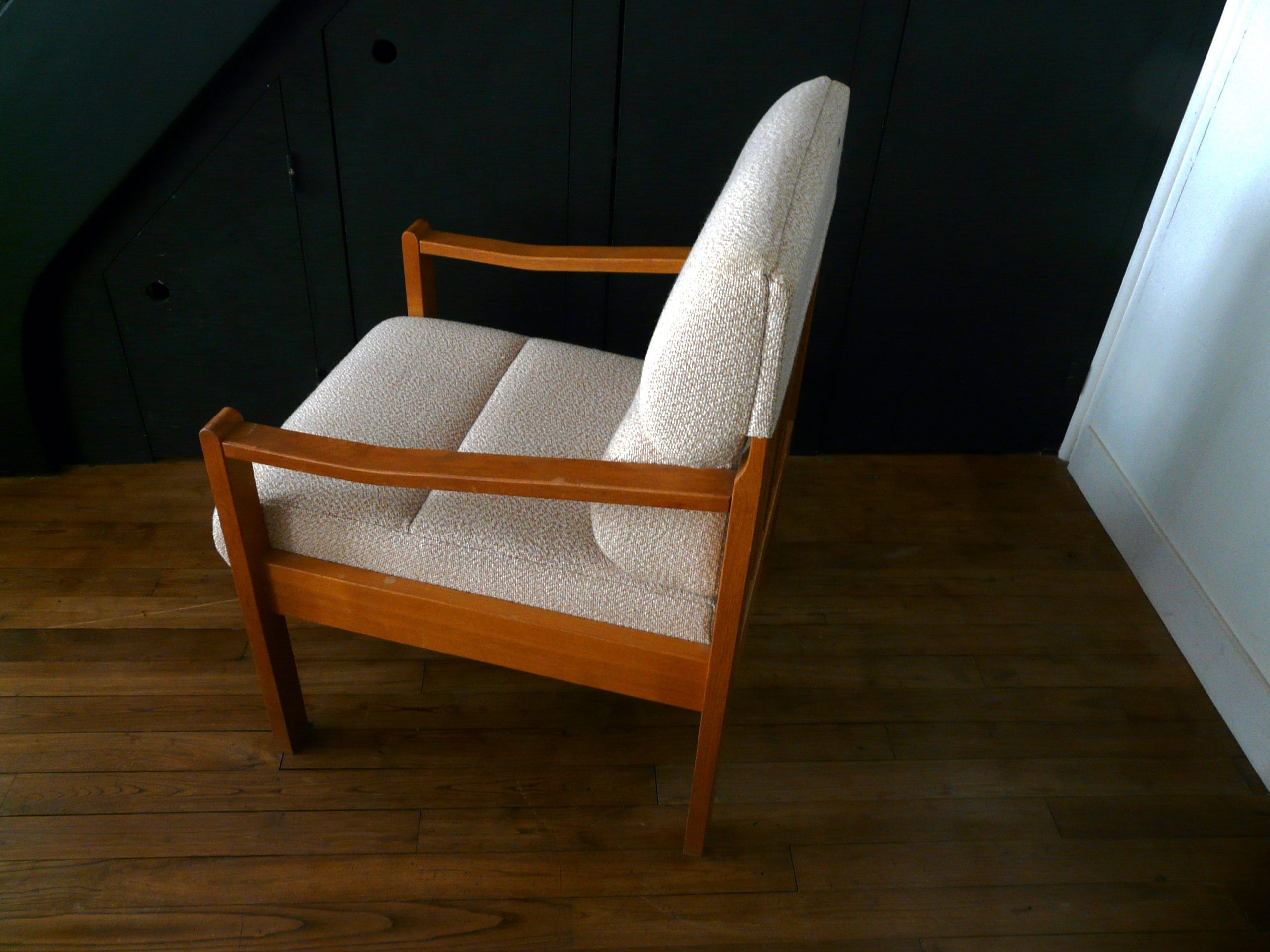 Confortable fauteuil Krasna Jizba. Il a été fabriqué en Tchécoslovaquie dans la deuxième moitié du XX siècle. Ce fauteuil en bois a été édité par Krasna Jizba qui encourageait les collaborations entre les jeunes designers, les artisans et les fabricants industriels. C’est un gage de qualité. Le fauteuil est estampillé. Sa ligne est sobre et moderne. Le tissu d’origine de couleur beige chiné est en bel état.