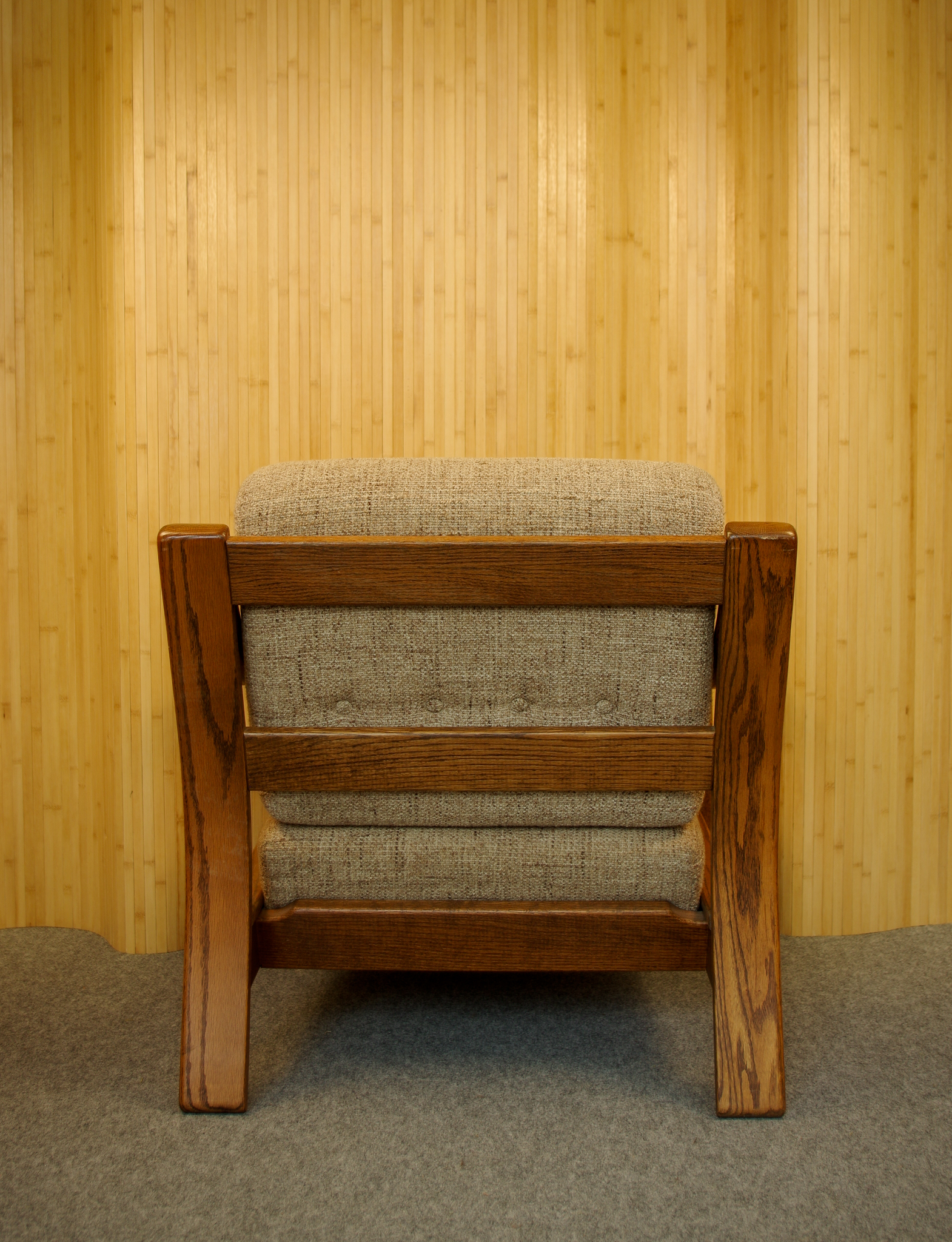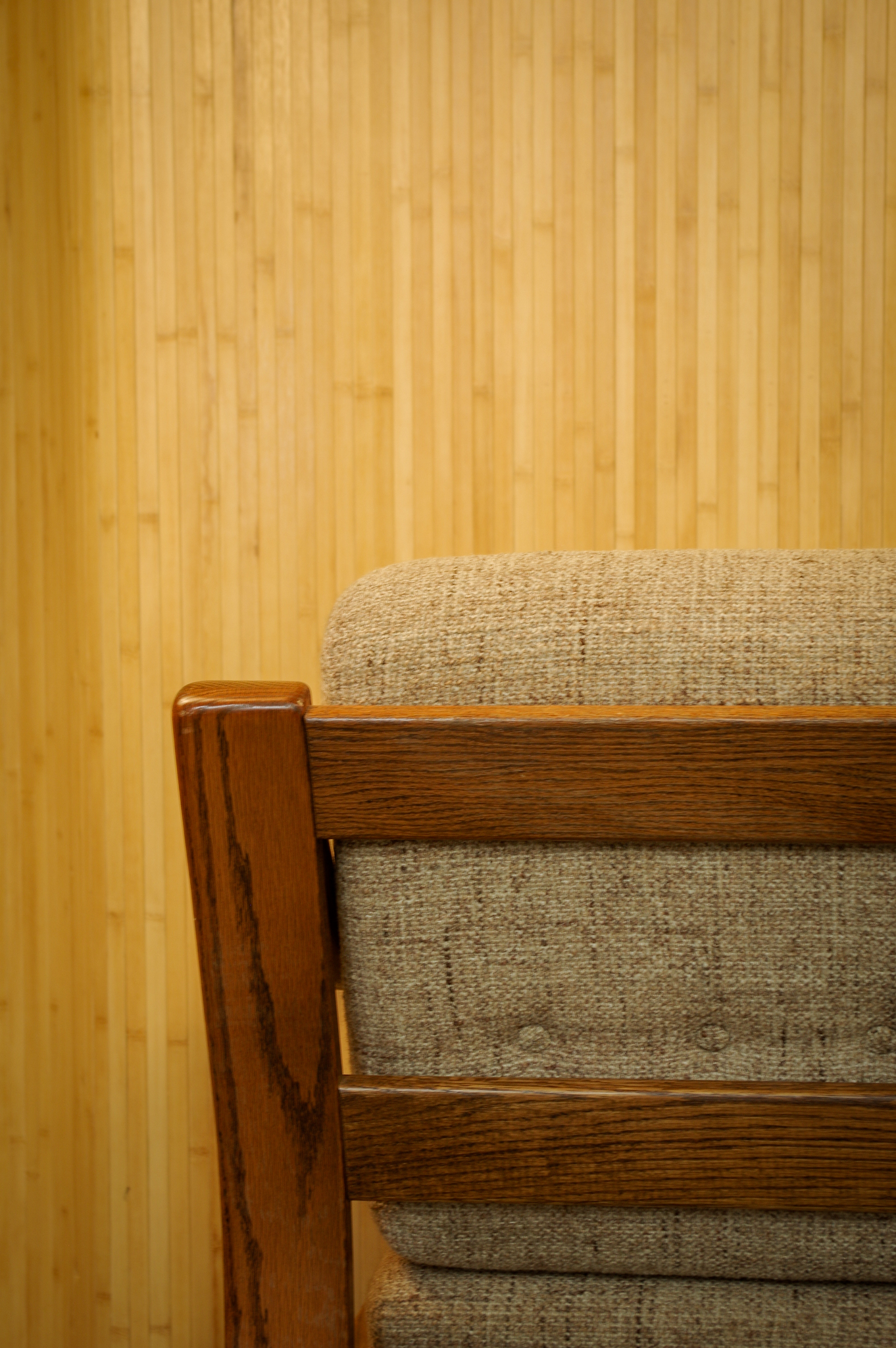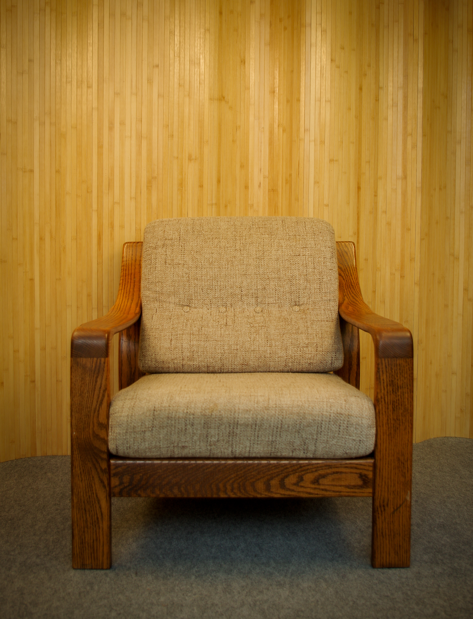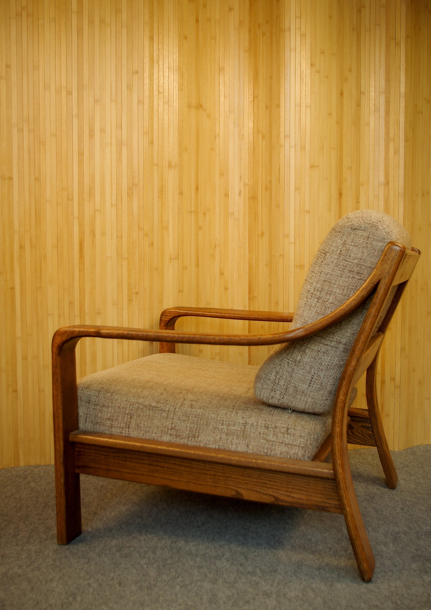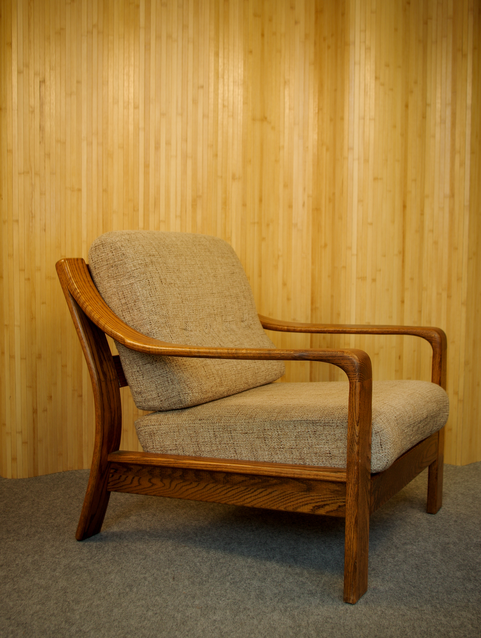 Voici le fauteuil vintage aux formes généreuses. Il a été fabriqué en Tchécoslovaquie dans les années 1950-60. Sa structure en bois est très joliment travaillé avec des belles courbes. L’assise et le dossier sont en mousse au confort moelleux. Ils ont été probablement retapissés par le passé. Le tissu amovible est en très bon état de couleur beige chiné.