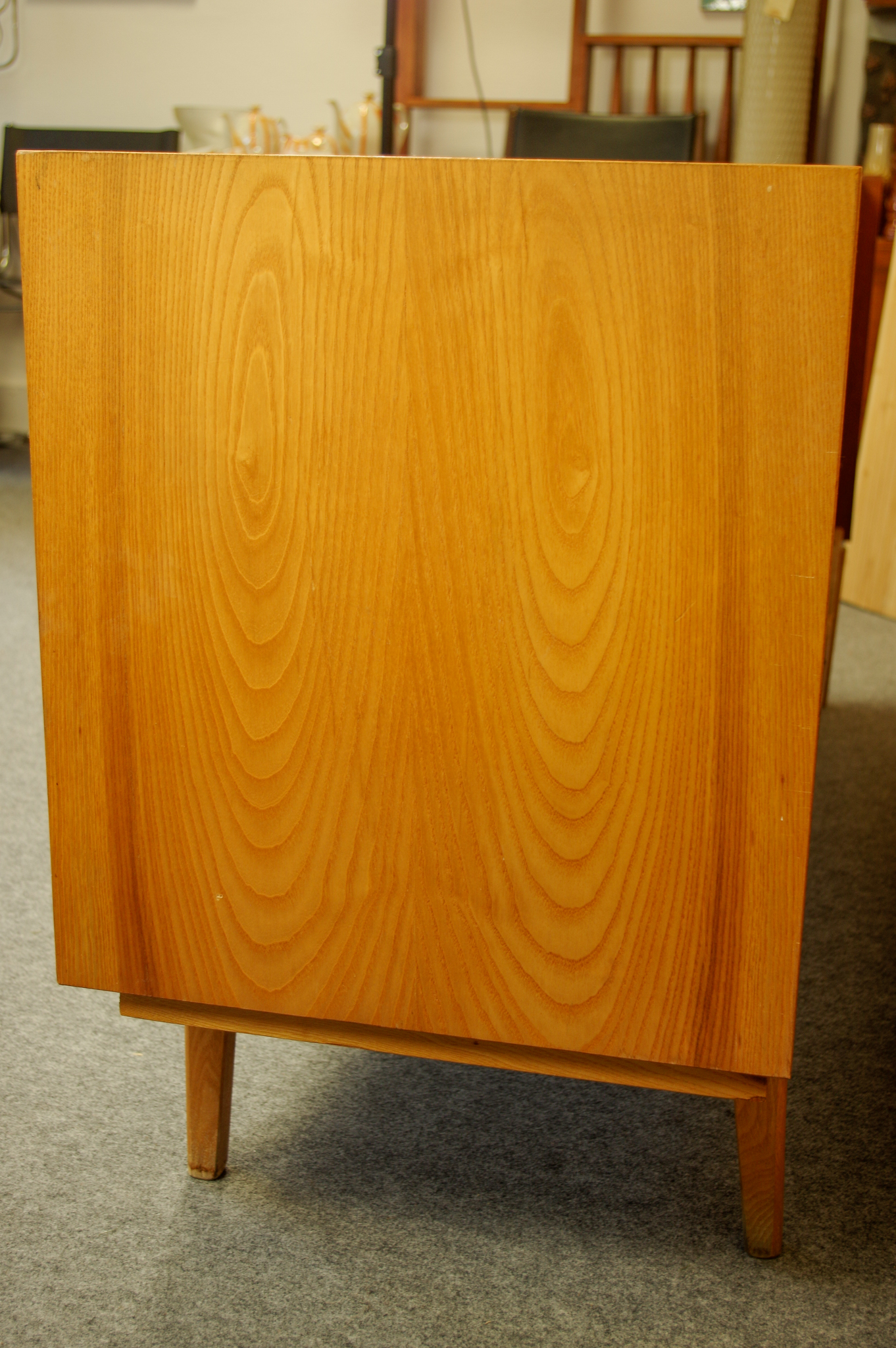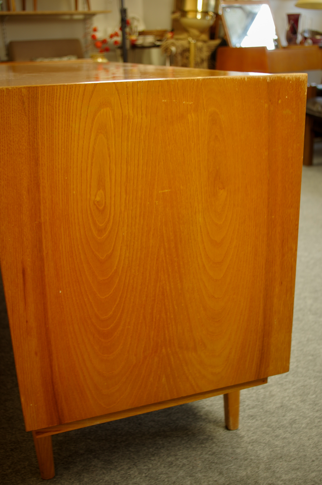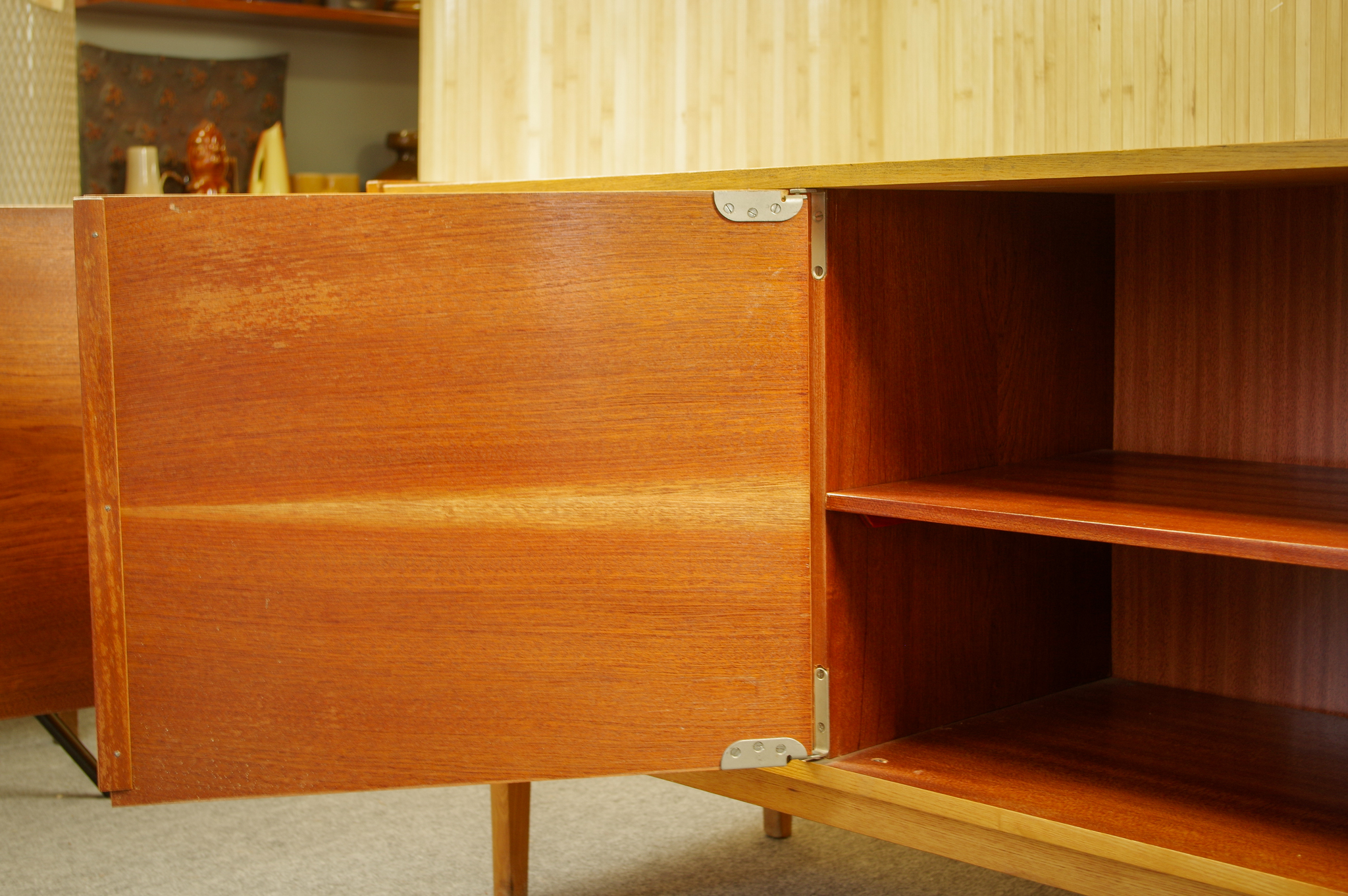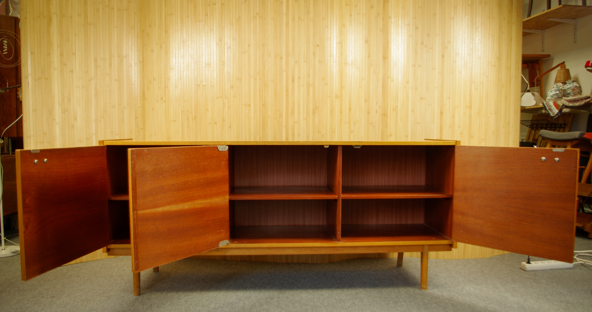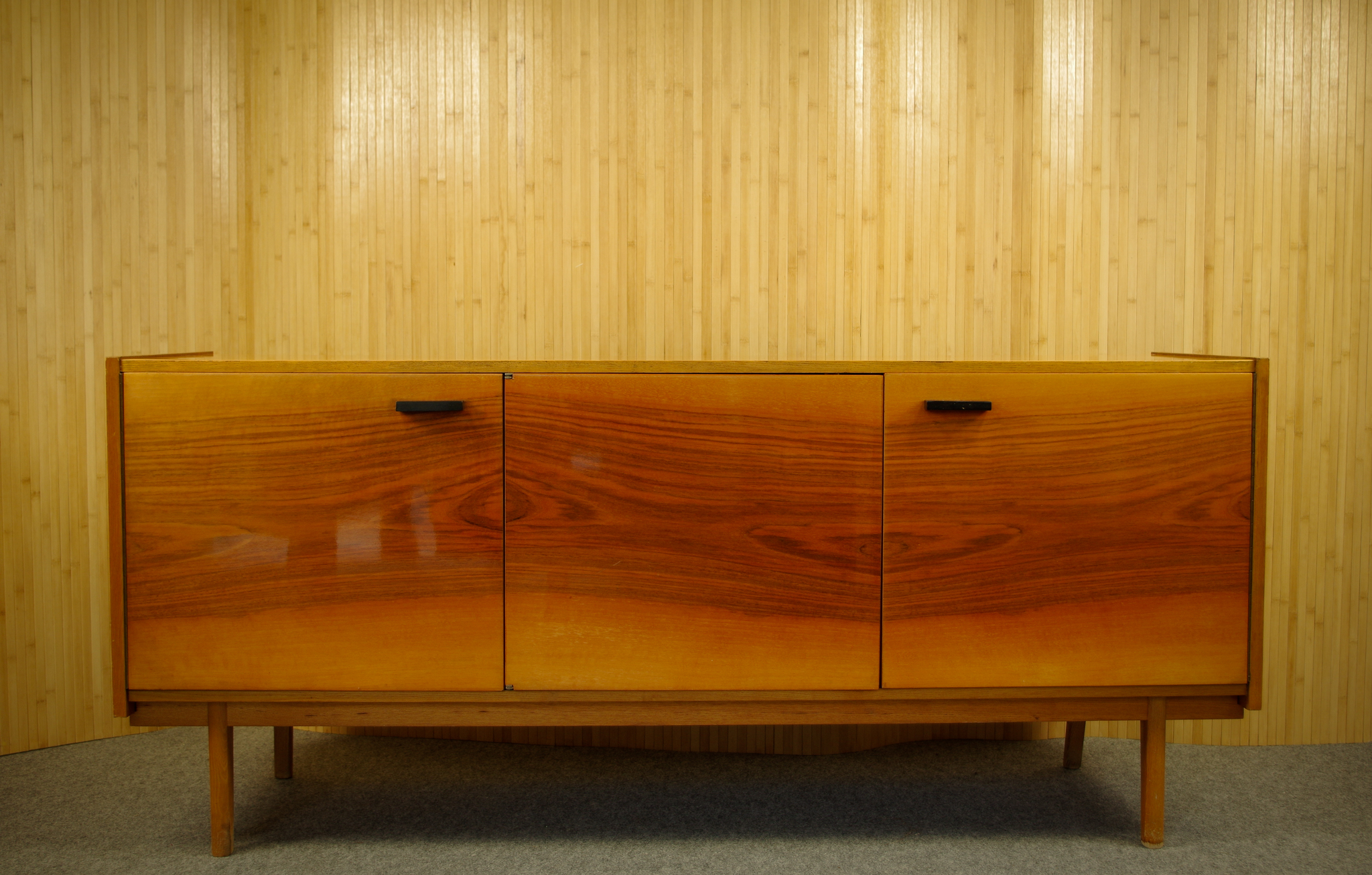 Cette grande enfilade vintage a été fabriquée en Tchécoslovaquie dans les années 1960-70. Elle est très pratique par sa taille généreuse. L’enfilade a trois portes battantes avec des étagères à l’intérieur. Des jolis boutons en bois foncé apporte une touche déco. Il y a un très joli travail effectué au niveau des pieds.