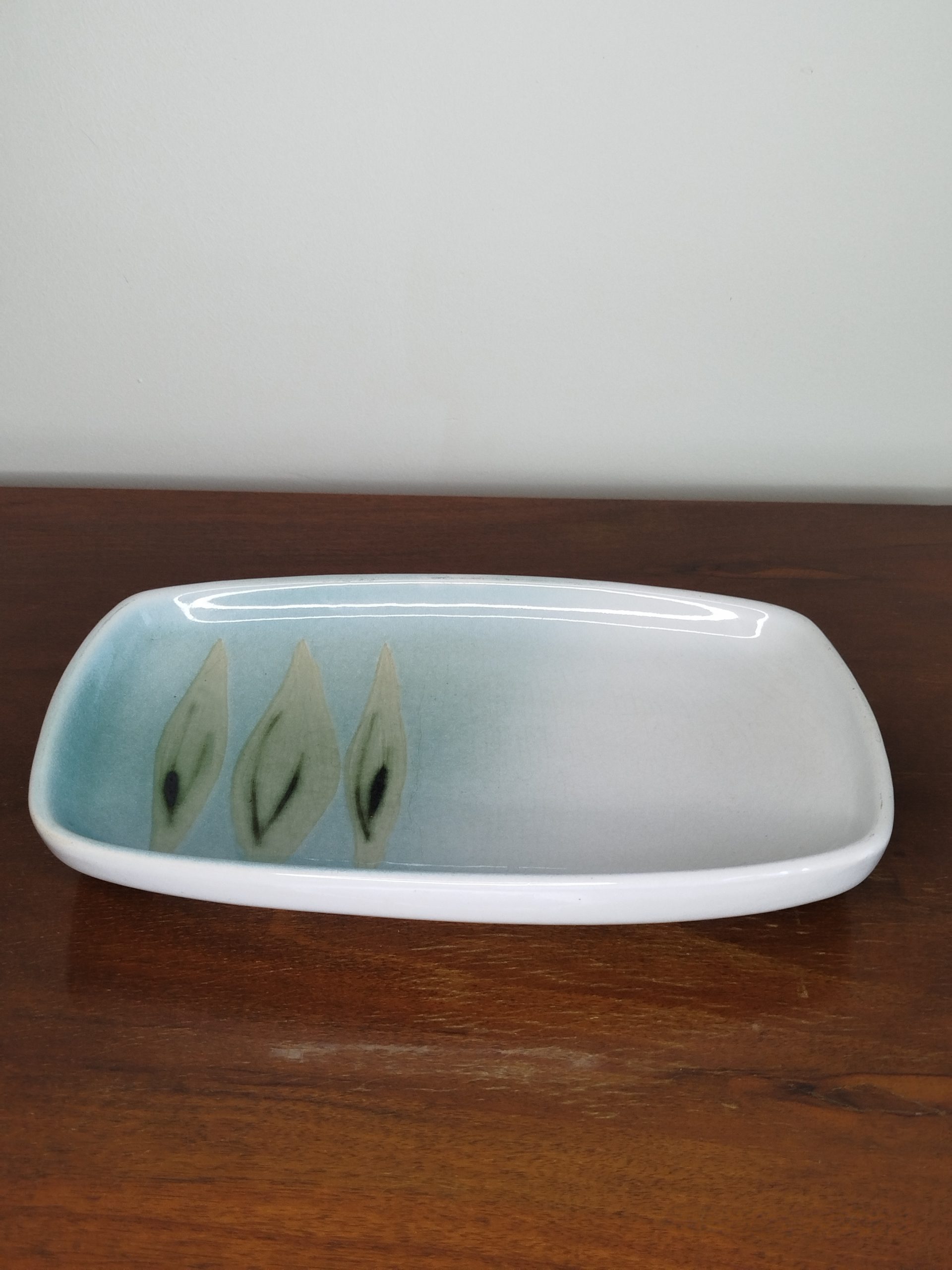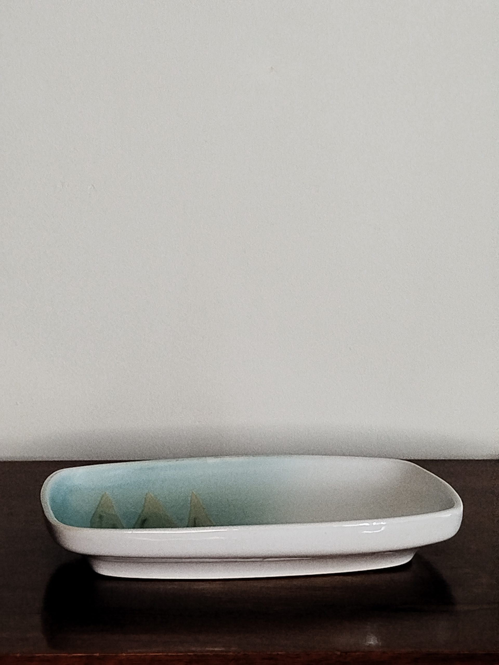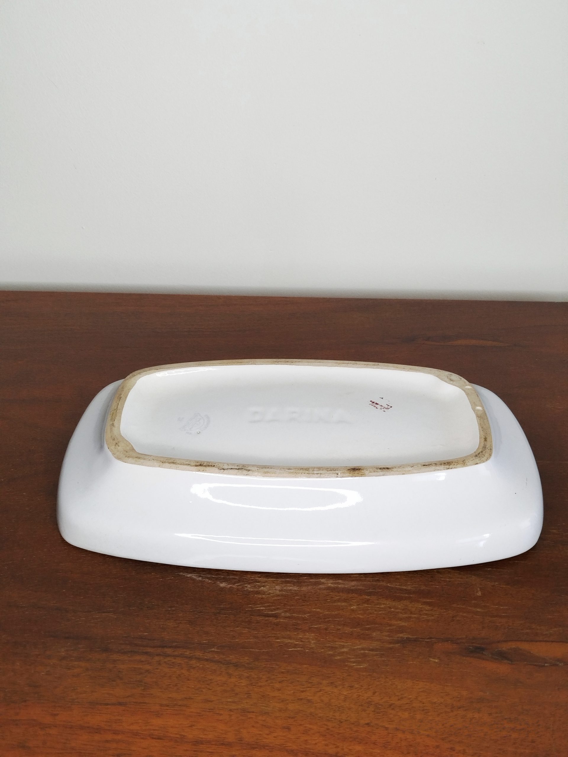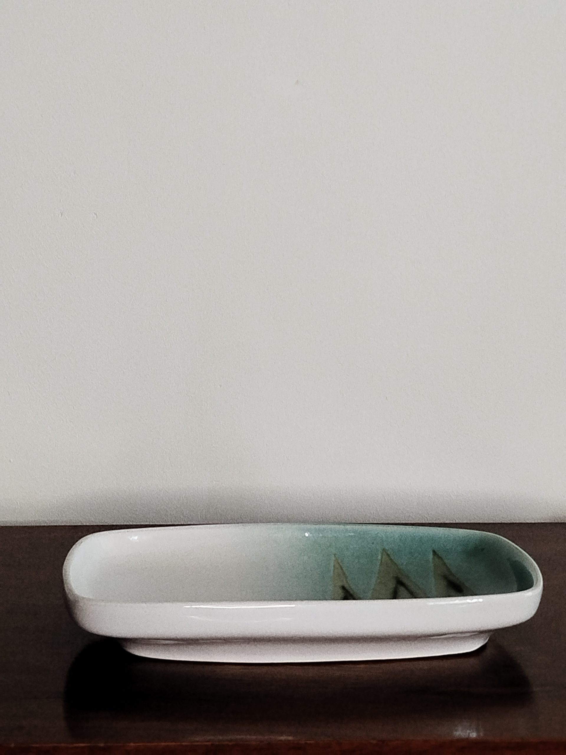 Grand plat Darina de Ditmar Urbach. Il est en céramique, numéroté et avec l’inscription du modèle (Darina – prénom féminin) et du fabricant. Ce plat a été fabriqué dans les années 1970 en Tchécoslovaquie. Il a une jolie ligne rectiligne avec l’émail beige et un motif abstrait en dégradé de vert à l’intérieur.